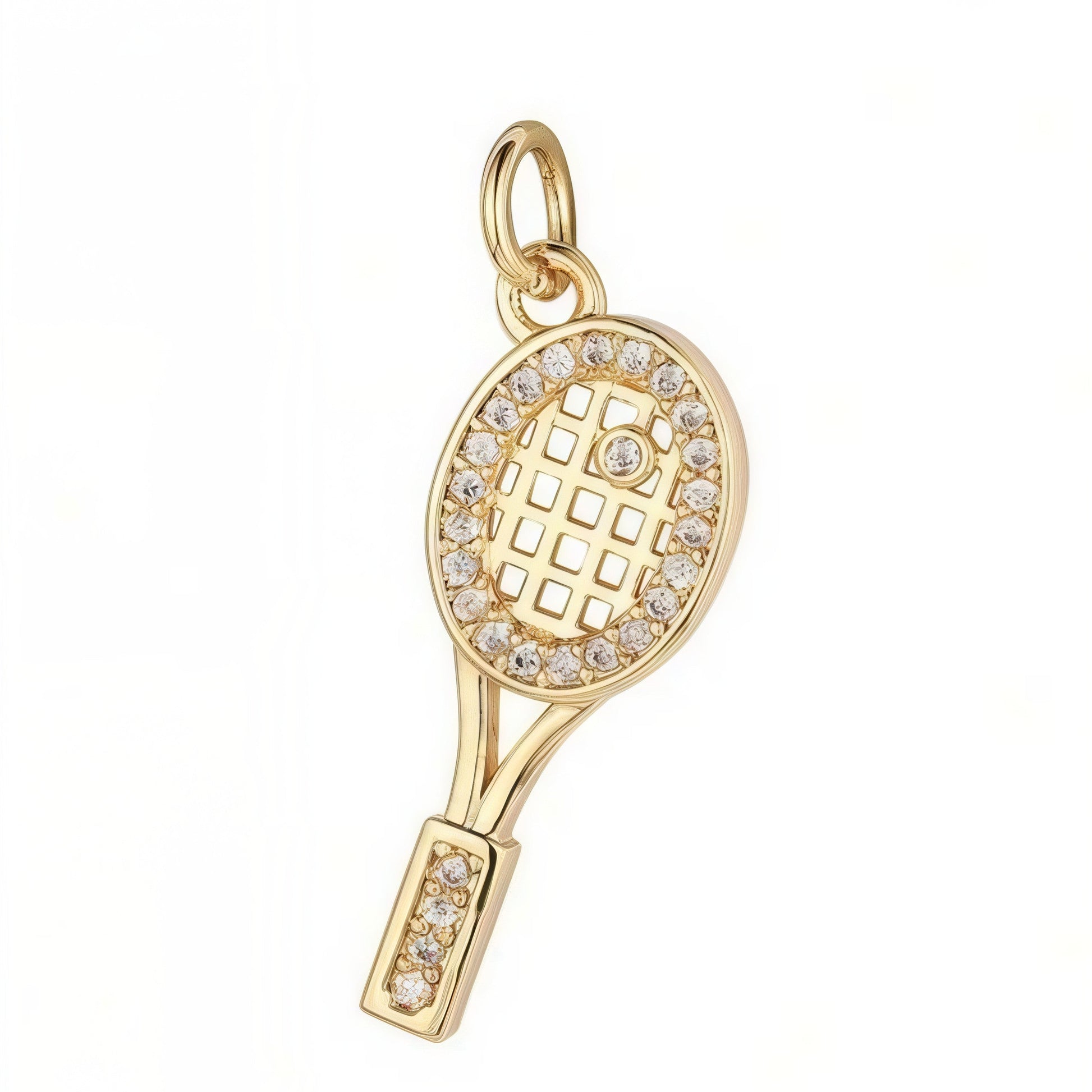 Elevate your style game with Court Luxe, a gold-plated tennis racket charm sparkling with hand-set rhinestones. This chic piece captures the grace and energy of the court, adding a refined, sporty touch to any look.