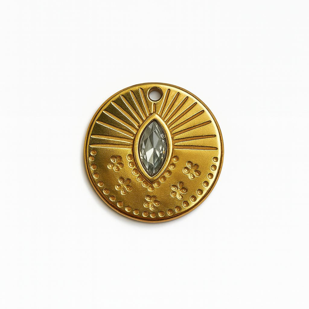 Elegance meets brilliance in the Rayelle charm. Crafted in lustrous gold, this pendant features a dazzling central gem that captures the light and radiates it like sunbeams. The intricate rays etched around the stone symbolize warmth, hope, and endless energy, while delicate floral details add a touch of softness and grace. Rayelle is more than a charm — it’s a quiet reminder to always shine, no matter what.